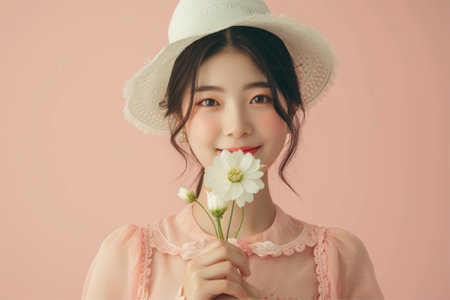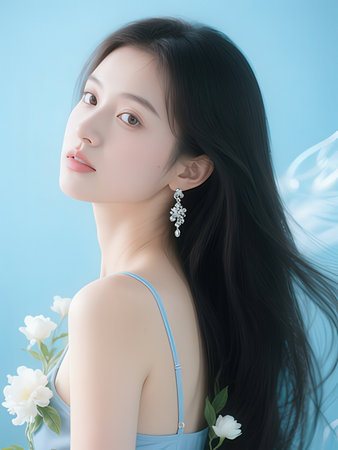 Beautiful asian woman with white flowers on blue background, asian beauty