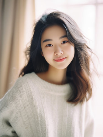 Young asian woman with long dark hair posing near a window with a city view in the background