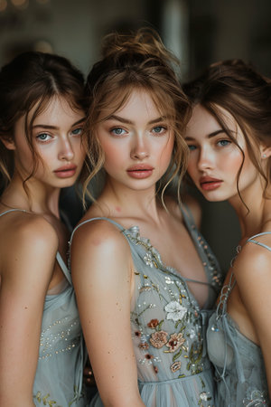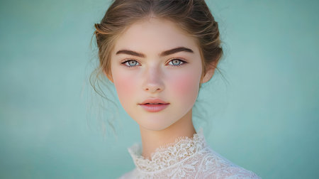 This portrait showcases a young woman with captivating blue eyes and soft, natural makeup, radiating beauty in a serene atmosphere. The textured background enhances the tranquil and elegant essence of the image.