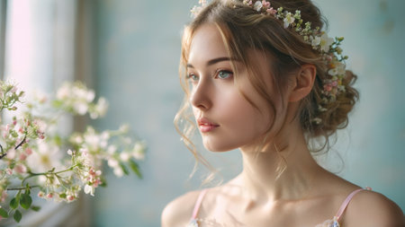 A young woman poses gracefully, adorned with a crown of delicate flowers. Soft lighting highlights her features, enhancing the serene ambiance of the indoor setting.