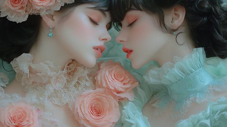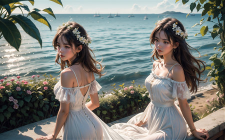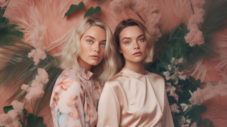 Portrait of two beautiful women in wedding dresses with flowers in their hair