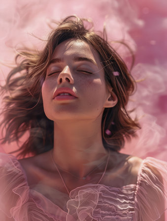 A young woman's playful spirit is accentuated by her whimsical freckles and a billowing white top against a pink backdrop