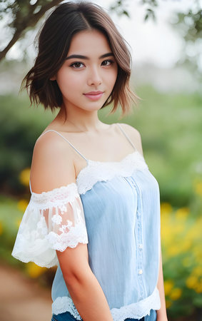 Asian woman adorned in ethereal bridal couture, standing amidst a picturesque garden adorned with blooming flowers. perfect for wedding magazines, bridal websites, and romantic themed advertisements