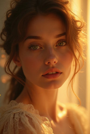 Young woman poses with a gentle gaze in a room bathed in soft light