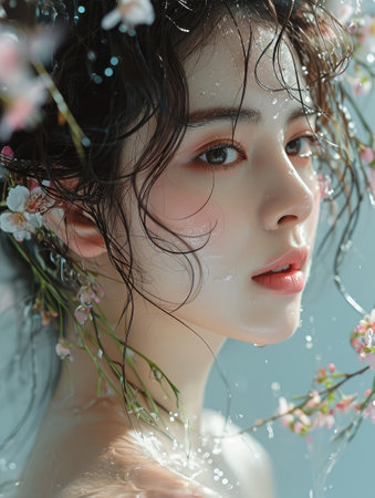 Close up portrait of beautiful young Asian woman with natural makeup and water splash on her face
