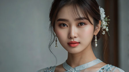 This captivating portrait showcases a young Asian woman with delicate features, exuding grace and tranquility. Her subtle makeup enhances her natural beauty, while the soft lighting creates a dreamy atmosphere, inviting viewers to appreciate her elegance and poise.