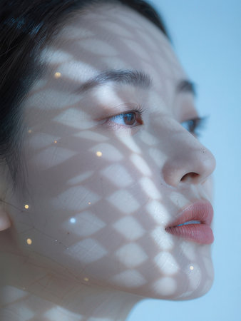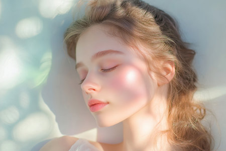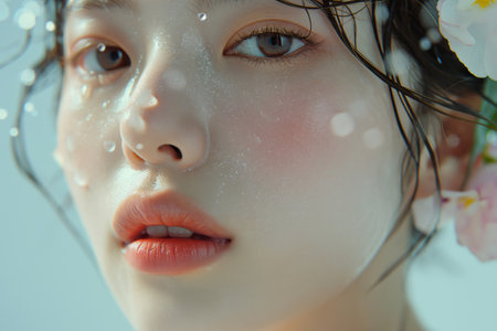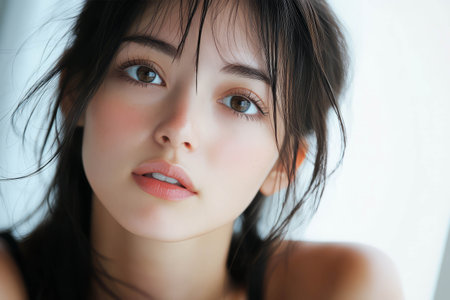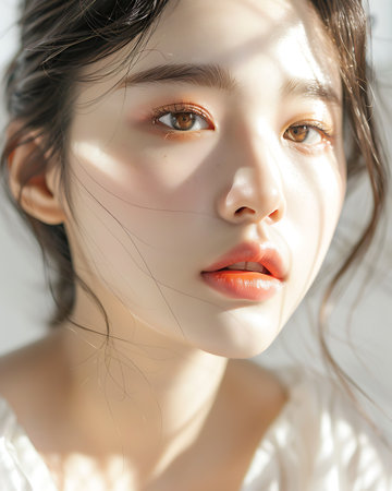 This captivating close-up showcases a young woman with flawless skin and a serene expression, highlighting her natural beauty. The soft lighting enhances her delicate features, creating an intimate and dreamy atmosphere that draws viewers in.