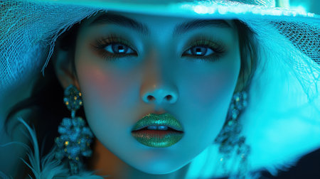 A model with radiant skin and bold lip color poses elegantly, wearing oversized earrings and a wide-brimmed hat. The background glows in vibrant shades, enhancing the artistic atmosphere of the evening event.