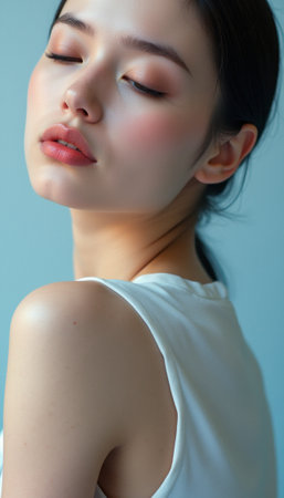 A stunning portrait of a young woman with flawless skin and delicate makeup, exuding tranquility and grace. Her gentle pose and closed eyes create an intimate atmosphere, inviting viewers to appreciate her beauty and poise.