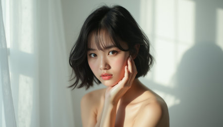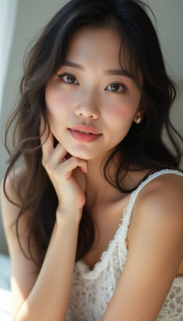 This stunning close-up features a young Asian woman with long, wavy dark hair, gently touching her face. Her soft expression and natural beauty radiate warmth and confidence, inviting viewers to connect with her serene presence.