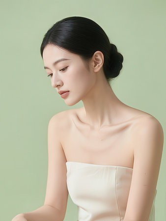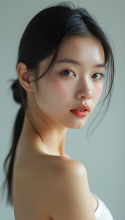 This studio portrait features a young Asian woman with dark hair and a neutral expression, lit with soft lighting on a gray background. The image is perfect for beauty and lifestyle concepts.