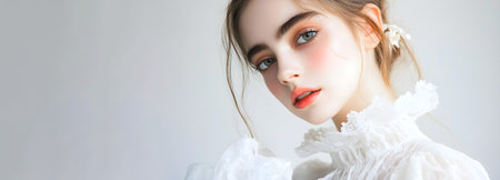 Elegant young woman with delicate makeup and a soft expression, wearing a white lace dress and floral hair accessories.