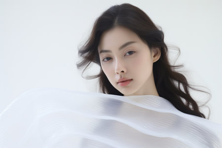 Elegant Asian woman with long hair in white dress, pastel backdrop, simple and serene design.