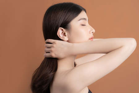 A potrait of beautiful well-groomedyoung Asian woman touching her face