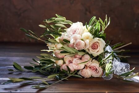 Beautiful summer wedding bouquet. Delicate bright Flowers for the bride. Preparations for the wedding ceremony. Wedding Bridal bouquet