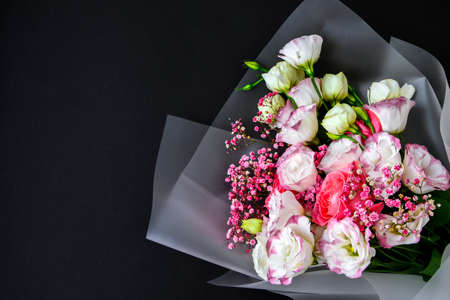 Flower bouquet on black background, beautiful floral arrangement, creative flowers and floristic design idea