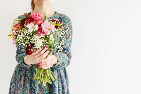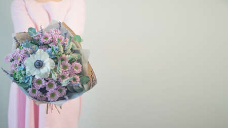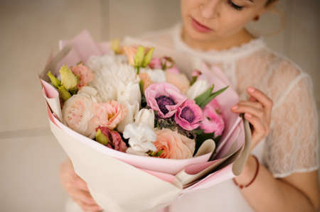 beautiful fresh cut bouquet of mixed flowers in woman hand. the work of the florist at a flower shop. Delicate Pastel tones color