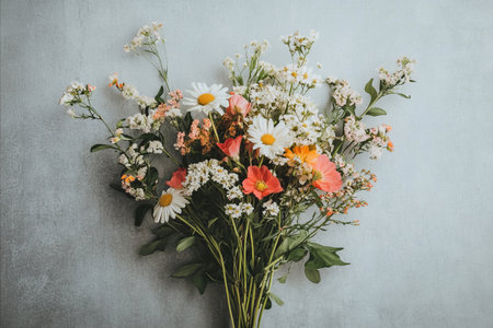 A rustic bouquet of wildflowers, featuring delicate daisies and vibrant orange blooms, artfully arranged on a light gray textured surface.