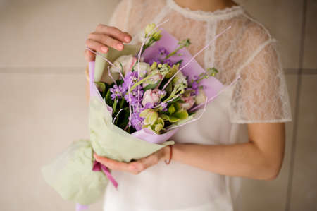 Pretty and delicate bouquet of white and purple flowers in the woman hands no face