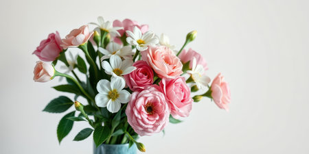 Delicate bouquet of soft pink roses and white flowers softly blurred with a bright open area ideal for adding text or quotes.