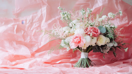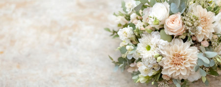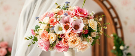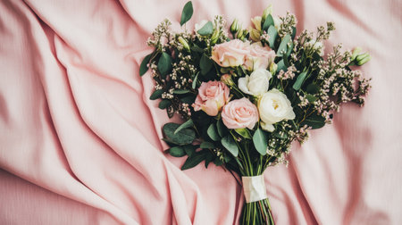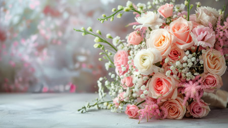 A beautifully arranged wedding bouquet on a table, with soft pastel background and space for text.
