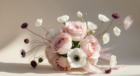 AI Generated. a delicate bouquet featuring pastel pink roses and white anemones accented with purple flowers in soft natural light