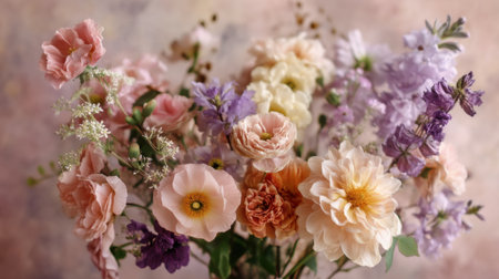 A stunning floral arrangement featuring soft pastel colors and various blooms, set against a textured gray background, perfect for artistic use.