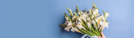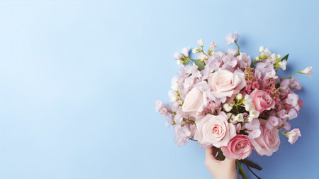 Hand holding a delicate bouquet of pink roses and flowers against a soft blue background