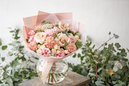 beautiful fresh cut bouquet of mixed flowers in vase on wooden table. The work of the florist at a flower shop. Delicate Pastel tones color