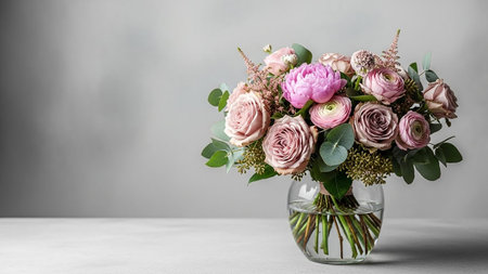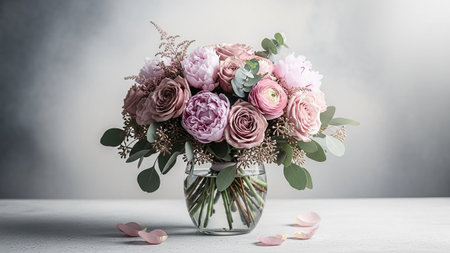 A lush and varied floral arrangement is presented in a clear glass vase, showcasing a mix of roses, peonies, ranunculus, and eucalyptus. The flowers display a harmonious palette of soft pinks, purples, and mauves, complemented by the fresh green of the eucalyptus leaves. The vase is filled with water, and the stems are visible, adding a natural The arrangement is set against a softly lit, textured grey background, with scattered petals on the white surface below. The studio lighting enhances...