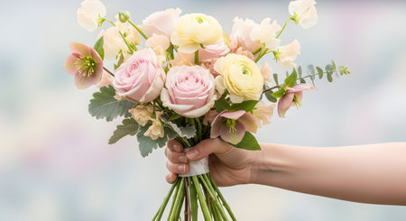 A hand gently holds a delicate bouquet of pastel flowers, featuring soft pink roses and creamy white ranunculus. The arrangement is fresh and romantic, set against a soft, blurred background.