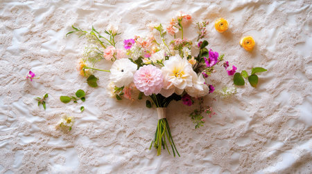 A stunning floral bouquet showcasing a variety of beautiful blossoms arranged artistically on a delicate lace background, perfect for any occasion.