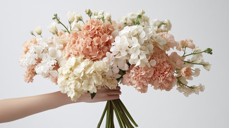 A minimalist bouquet of mixed pastel flowers, including hydrangeas and lisianthus, beautifully presented in a woman's hand