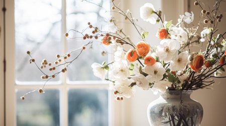 Bouquet of flowers in vase and home decor details, luxury interior design
