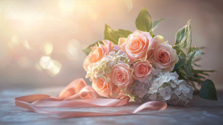 A beautifully arranged bouquet featuring soft pink roses and white hydrangeas rests elegantly on a surface, illuminated by gentle, warm light, creating a serene and romantic atmosphere.