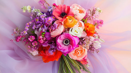 A stunning floral arrangement featuring an array of colorful blooms set against a soft pastel background, evoking a sense of elegance and tranquility in nature.