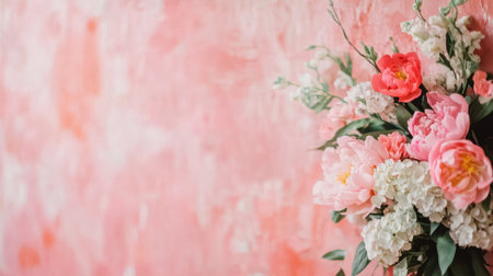 Close-up of a blooming peony and hydrangea bouquet on a textured pink background, floral details in focus