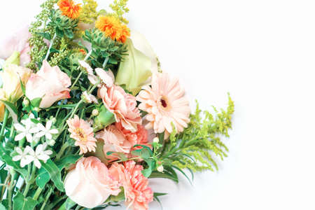 Bouquet of gerbera, roses and carnations on white background copy space.