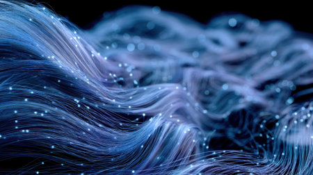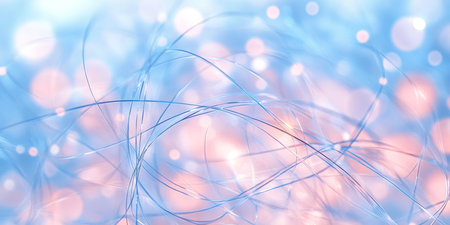 Delicate, glowing fibers flow through a cool blue space, illuminated by soft, out-of-focus lights. This abstract background evokes a sense of calm energy, digital connection, or a dreamy, ethereal landscape, perfect for themes of technology, serenity, and modern design.