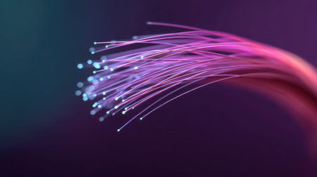 Vibrant and colorful strands of fiber optics create stunning visual display, radiating light in shades of purple, pink, and blue against dark background, evoking sense of wonder and innovation