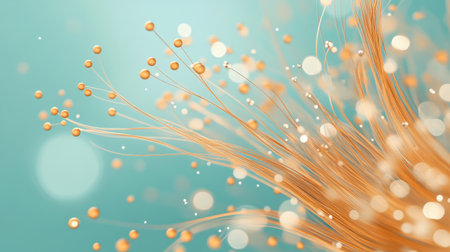 Microscopic view of abstract nanostructures with glowing spheres and delicate fibers on a teal background..