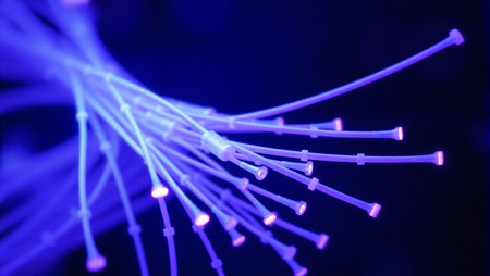 A captivating closeup of vibrant fiber optic cables showcasing glowing lights against an abstract background, symbolizing technology and innovation in modern communication.