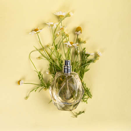 perfume bottle with chamomile scent on yellow background flat lay.