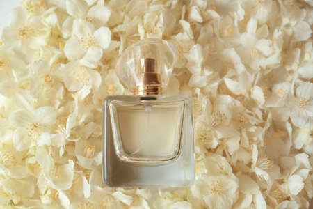 Bottle of jasmine perfume on white flowers, top view