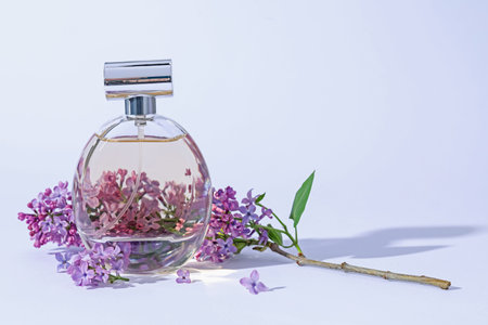 Perfume bottle and branch with lilac flowers on light gray background, closeup