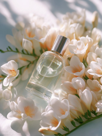 The fragrance bottle stands gracefully surrounded by fragrant blooms, capturing a serene moment.