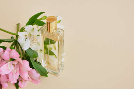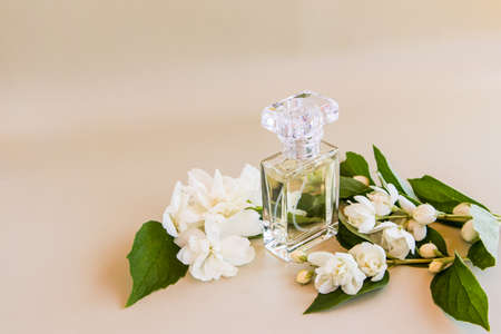 a bottle of luxurious women's perfume with notes of jasmine. delicate floral fragrance. the expression of natural odors. beige background