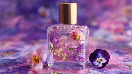 This image features an elegant glass perfume bottle adorned with colorful flowers, set against a soft purple background, evoking beauty and tranquility.