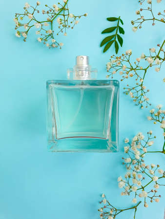 Image of elegant perfume bottle over blue pastel background