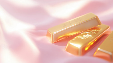 Three gleaming gold bars rest on soft pink fabric, symbolizing luxury and wealth. The elegant contrast offers a sophisticated and stylish visual.